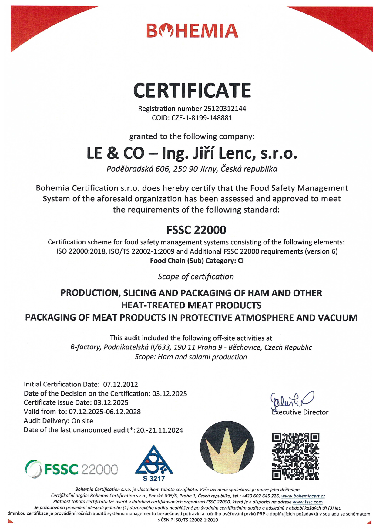 Garancí tohoto přístupu by pro vás konečné zákazníky i obchodní partnery měla být certifikace společnosti LE & CO dle standardů ISO 22000, FSSC 22000, IFS a HACCP. Tyto certifikáty zaručují velmi vysokou kvalitu výroby a systém hygieny a bezpečnosti potravin dle mezinárodních potravinářských standardů.